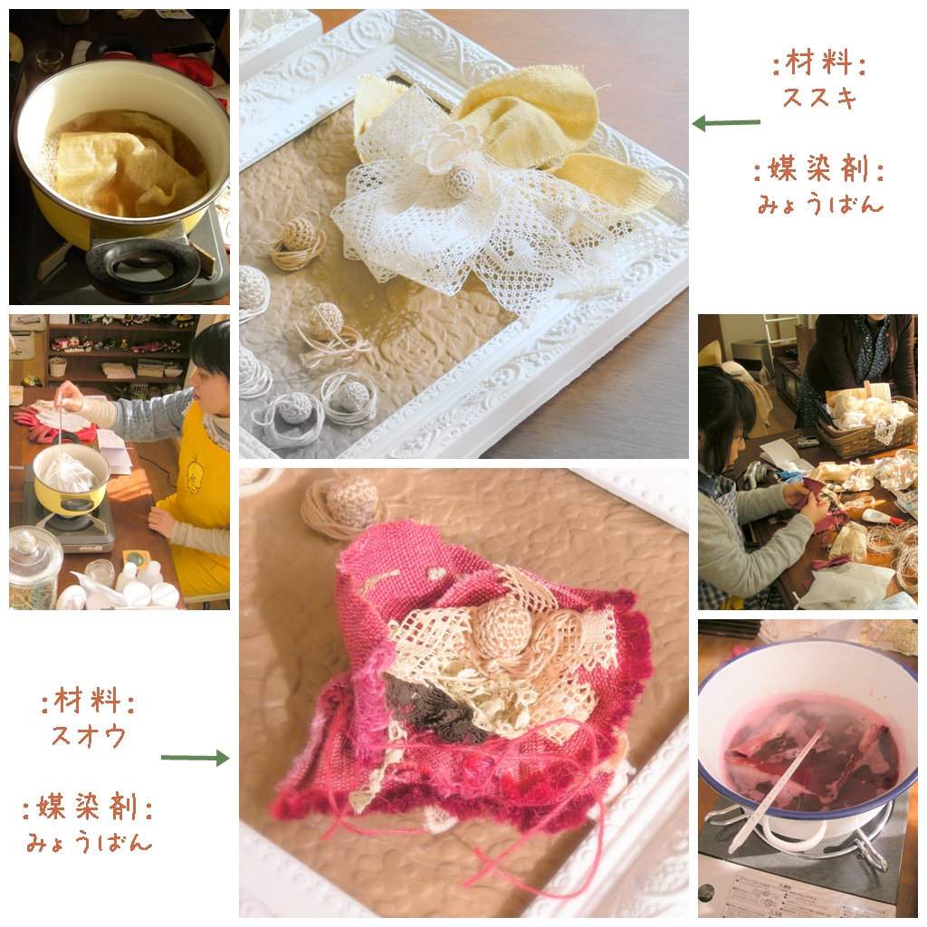 O先生の茜の染液で、まっしろなレースをかわいいピンクに変身させてましたなぁ。