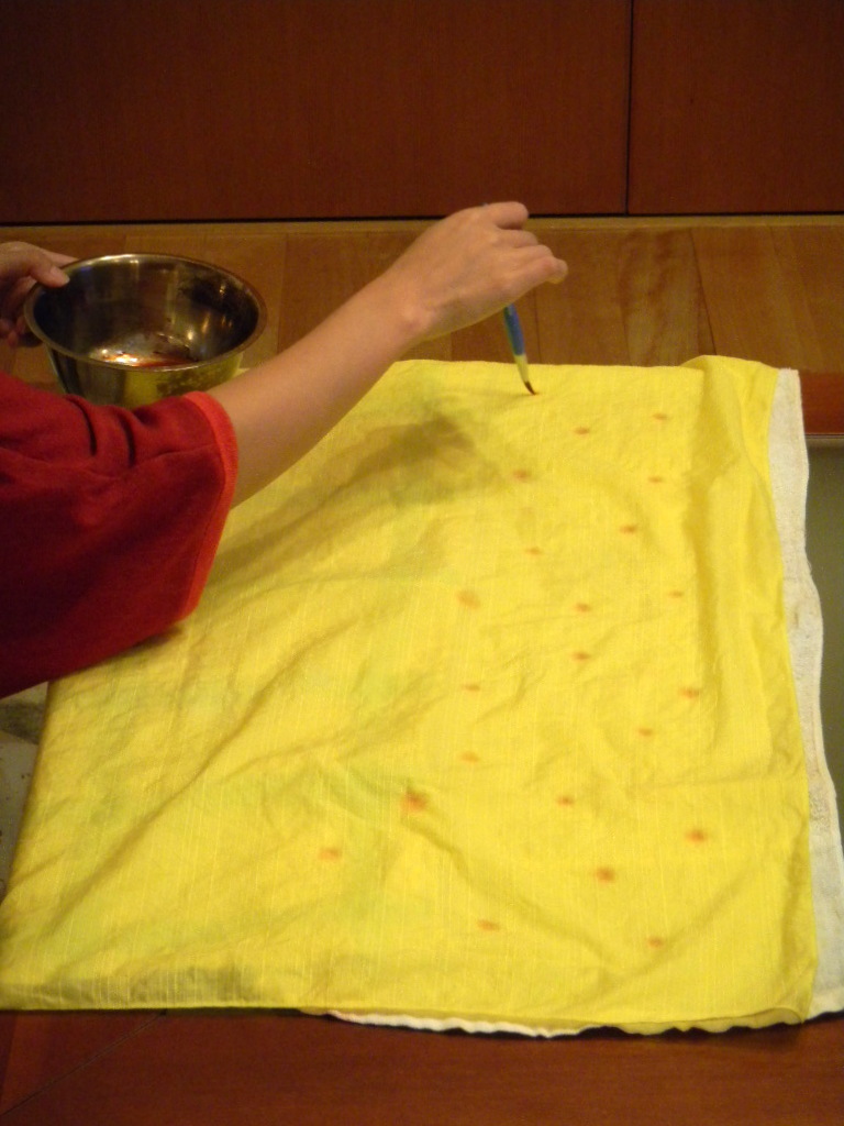 地色を染めた風呂敷に、別色でドットに染めているところ。