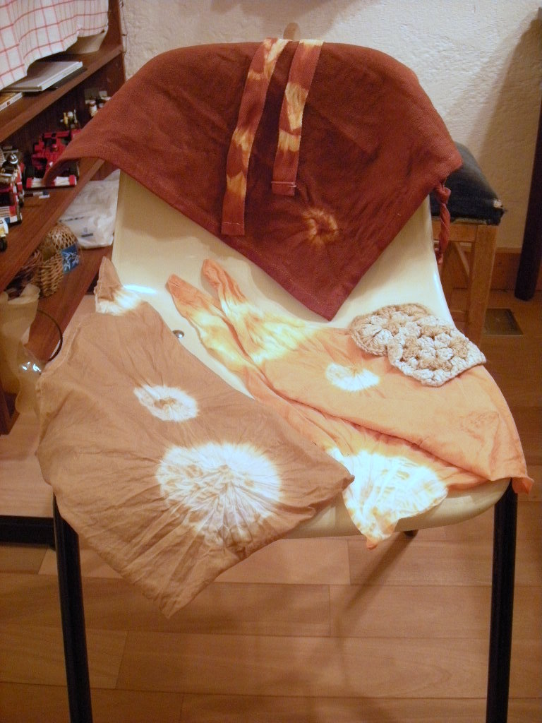 *ハンカチ⇒杉。その他をびわの葉で染色。