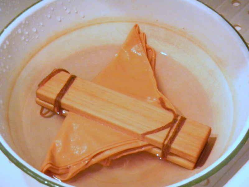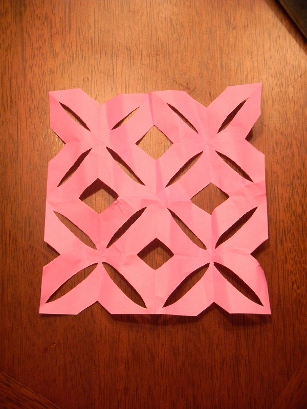 折り紙を畳んで、切りとった部分と残った部分が媒染剤によって発色を変えます。(この文章でわかるかなぁ~