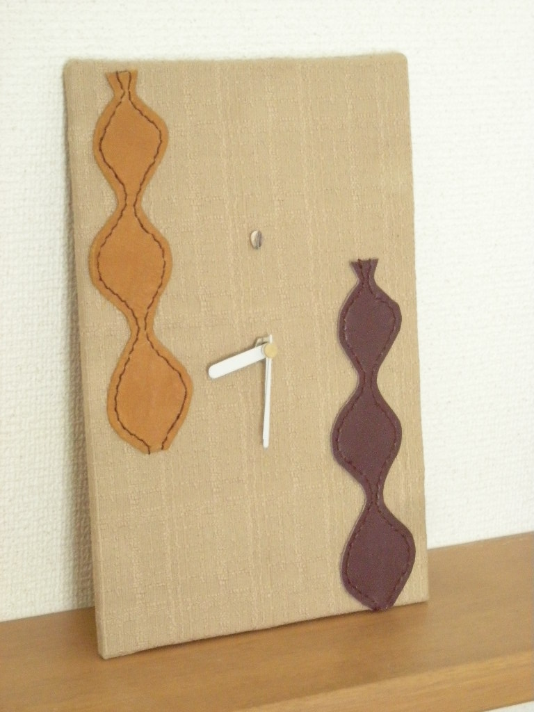 革を縫いつけています。12時の位置表示は貝のビーズです。