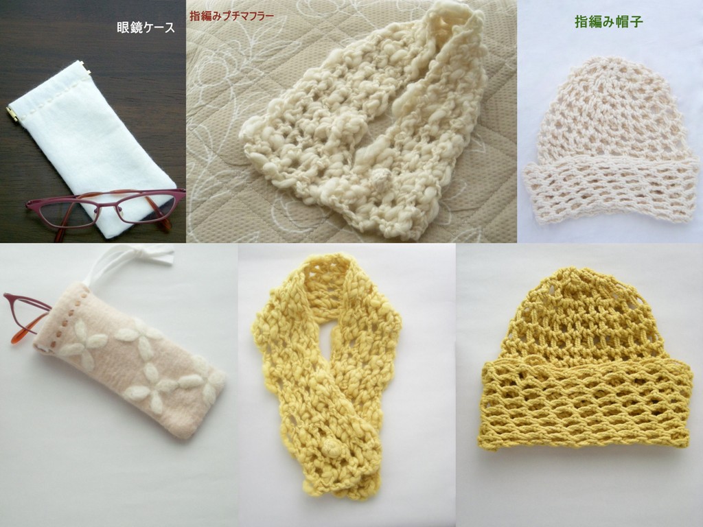 写真上)染色前  左から眼鏡ケース、ウールのプチマフラー、コットンの帽子