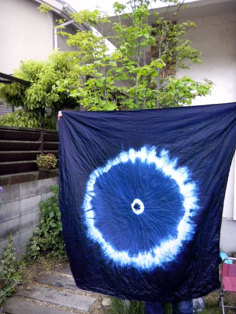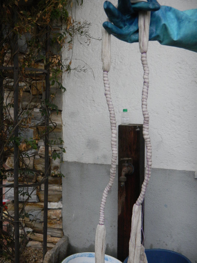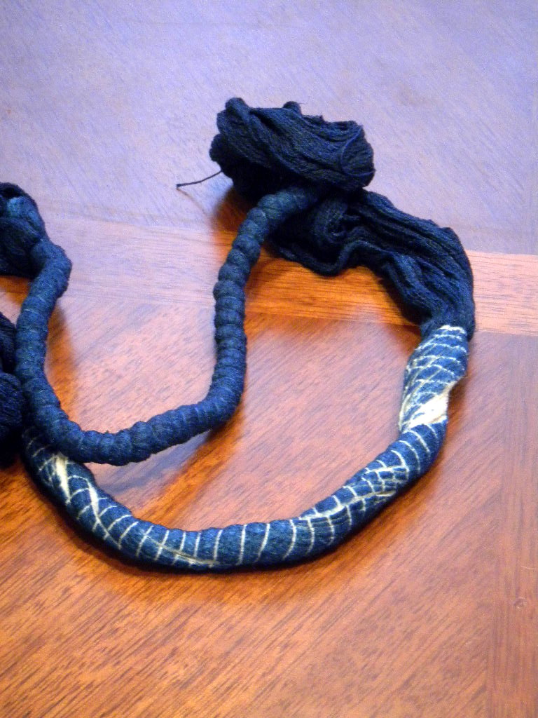 糸を巻いたところは藍が入らないので白く抜けるわけですな。エッヘン。