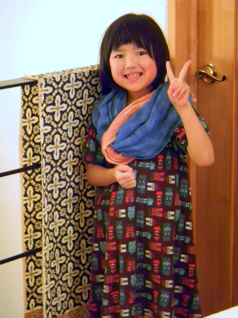 お気に入りの布の前で、出来たてほやほやの虹色ストールを巻いて