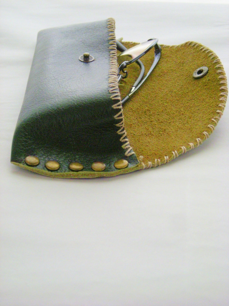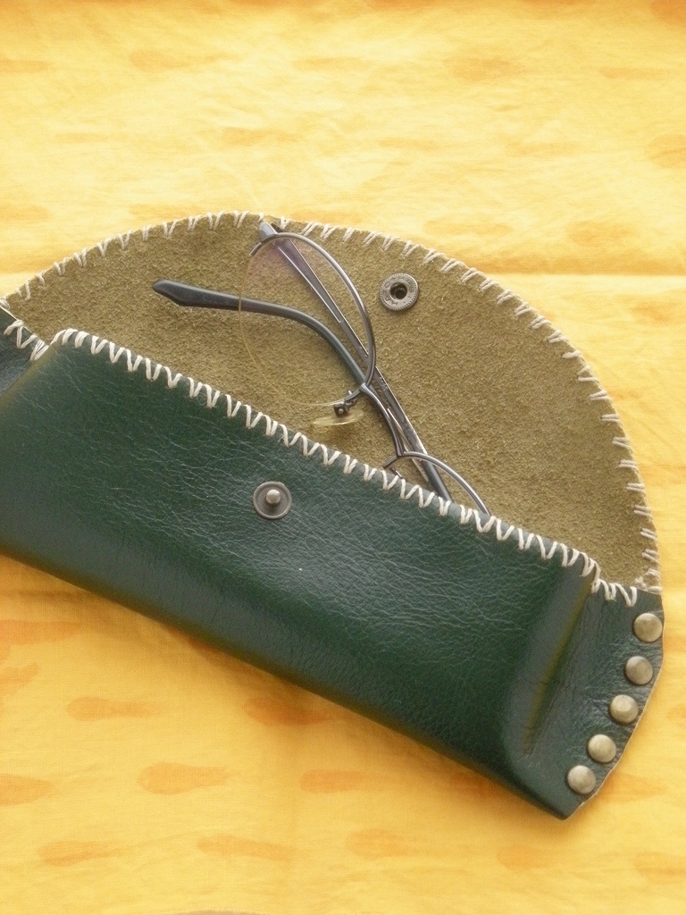 サンプルは、グリーンの革、ログウッドで薄く染めた糸を使っています。