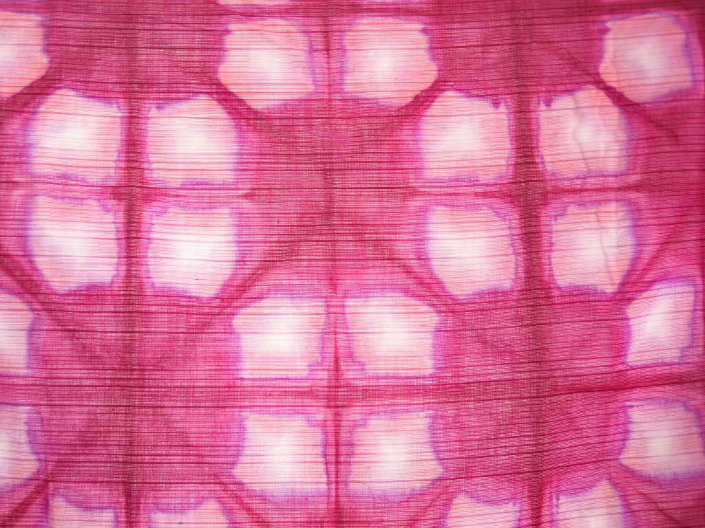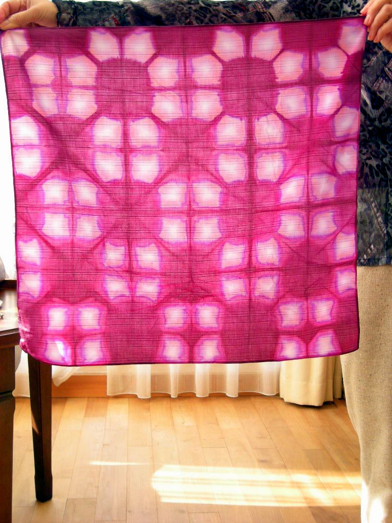 木綿の風呂敷を6つに屏風畳みして、正三角形の板で挟んで全体を染めています。