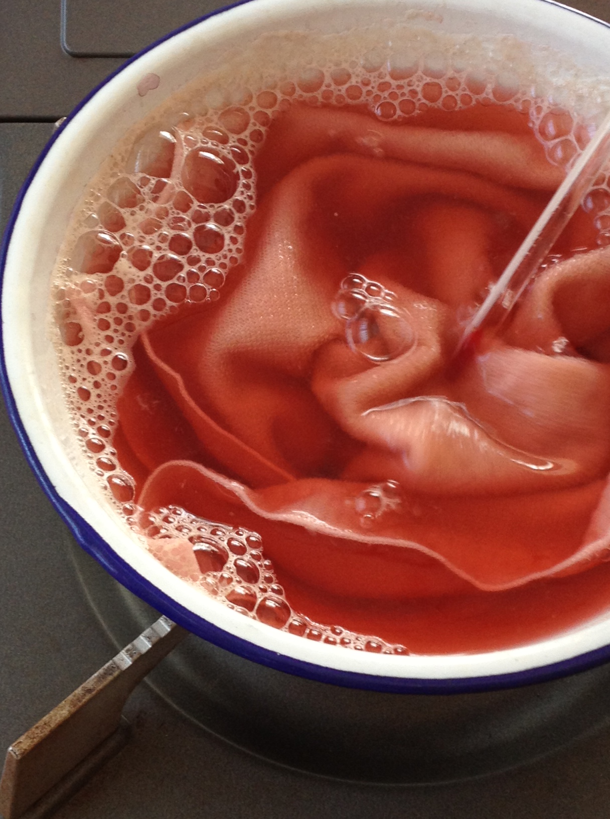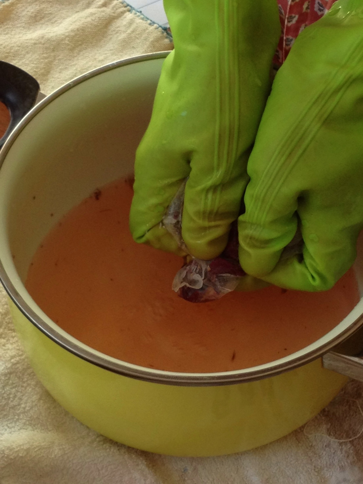 それを、50度位に温めて(高温にすると赤色が飛ぶからです)染色。