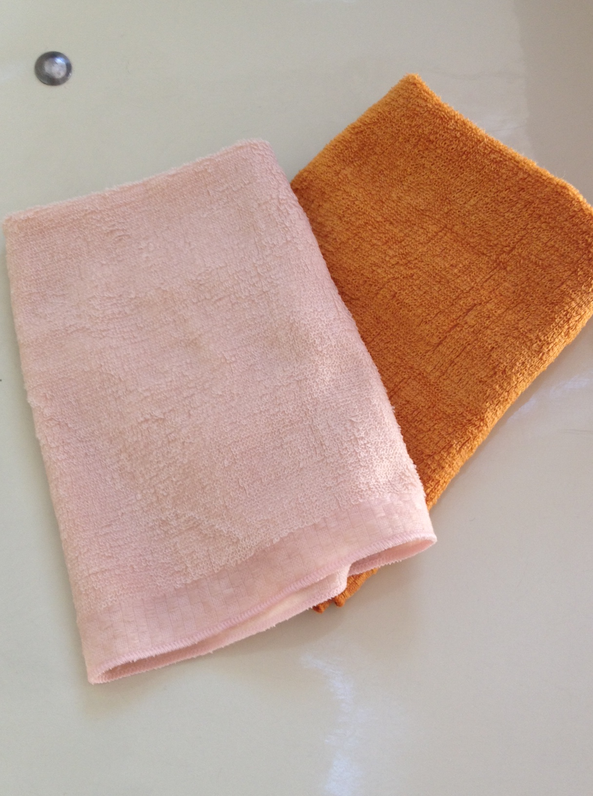 水で薄めたお酢でバラの花びらをギュギュと揉んでます。