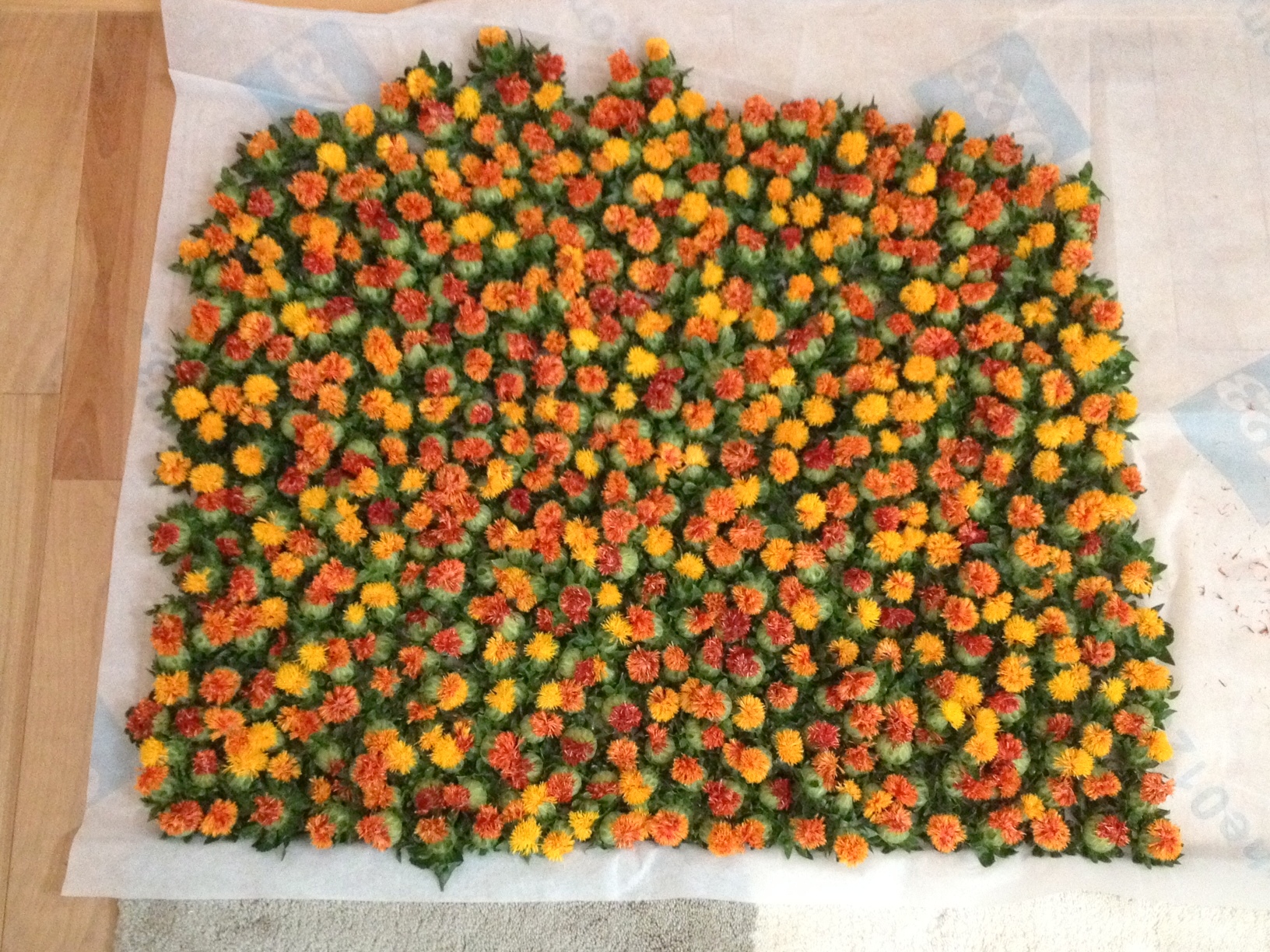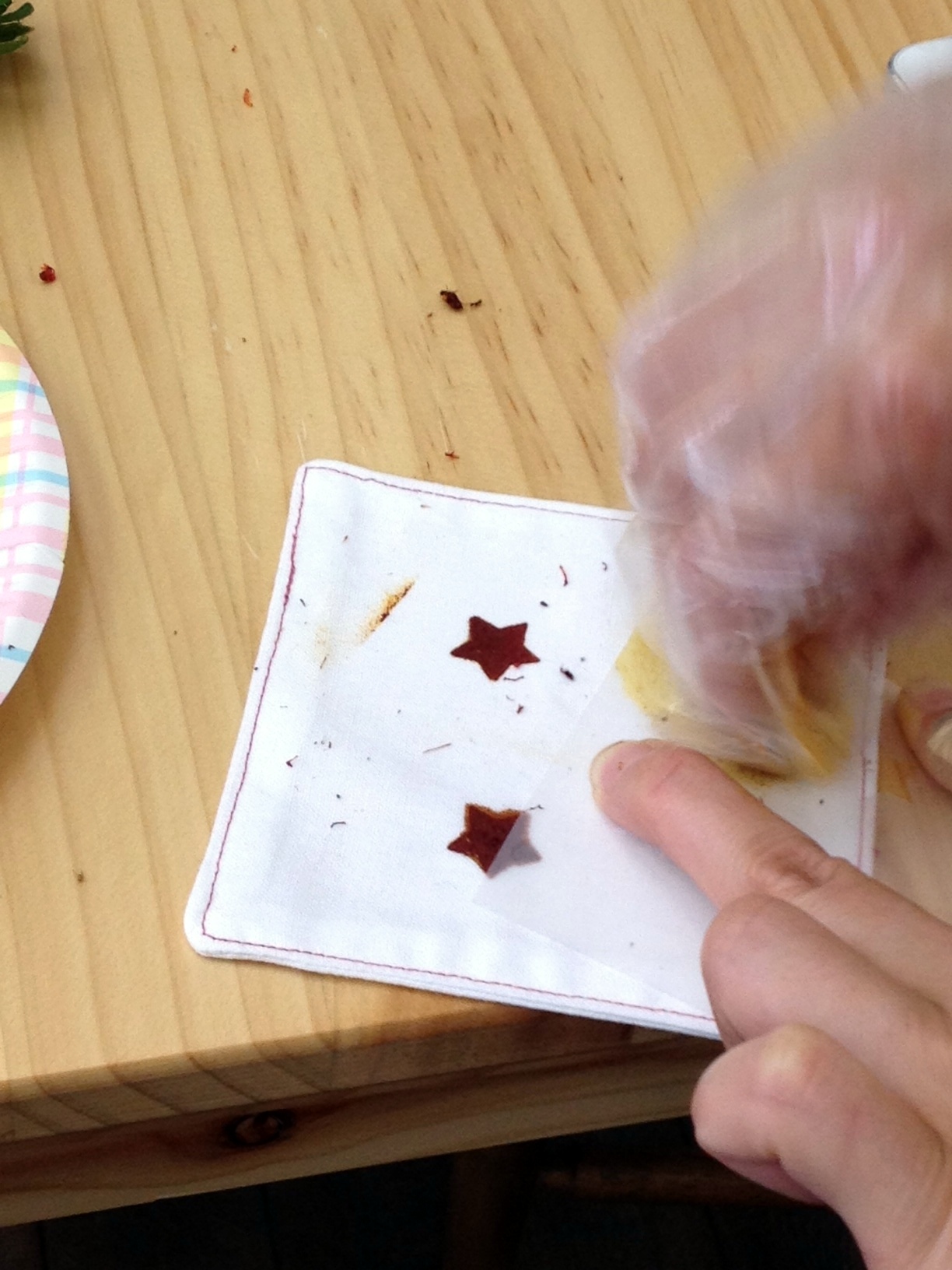 ②茶色に変色した花びらを布に刷り込みます(今回は型を使っています)。