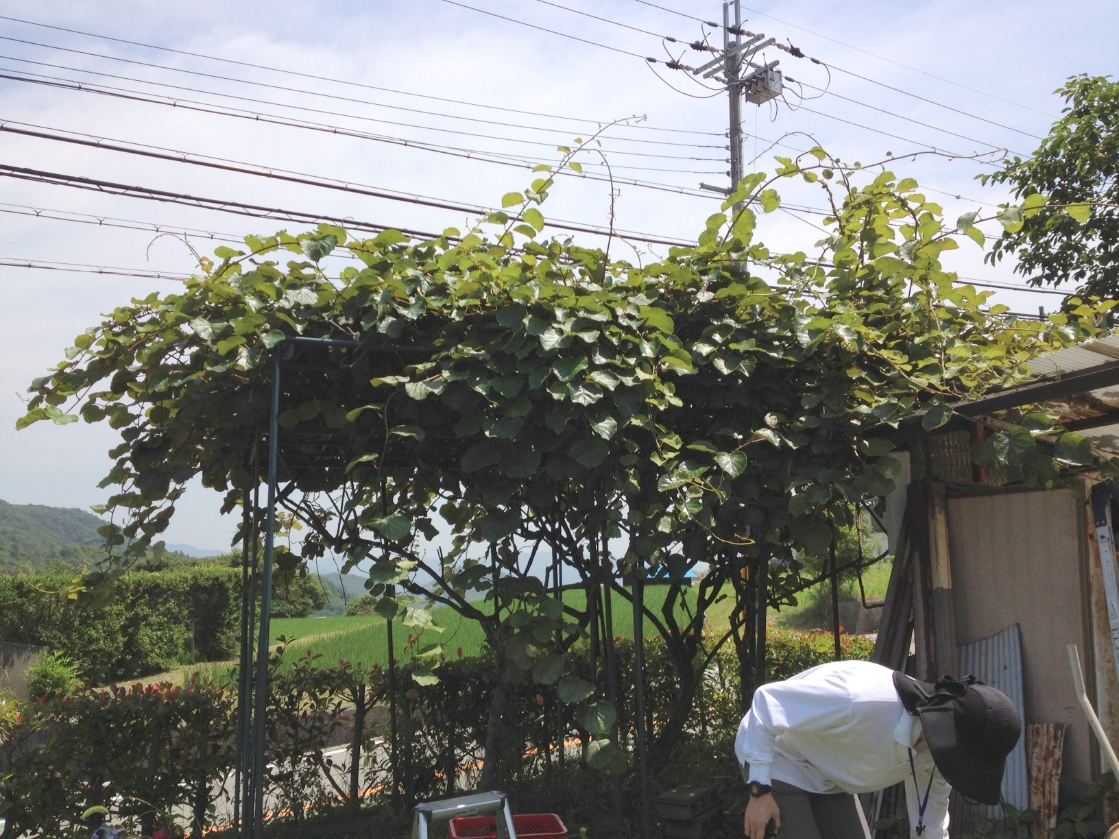 船坂の住人の方のお庭のキウイの間引き作業をお手伝いすることになりました。