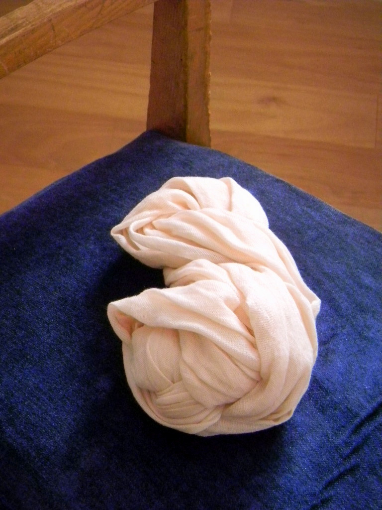 それでもって、染めた糸で指編みシュシュを編み編みします。
