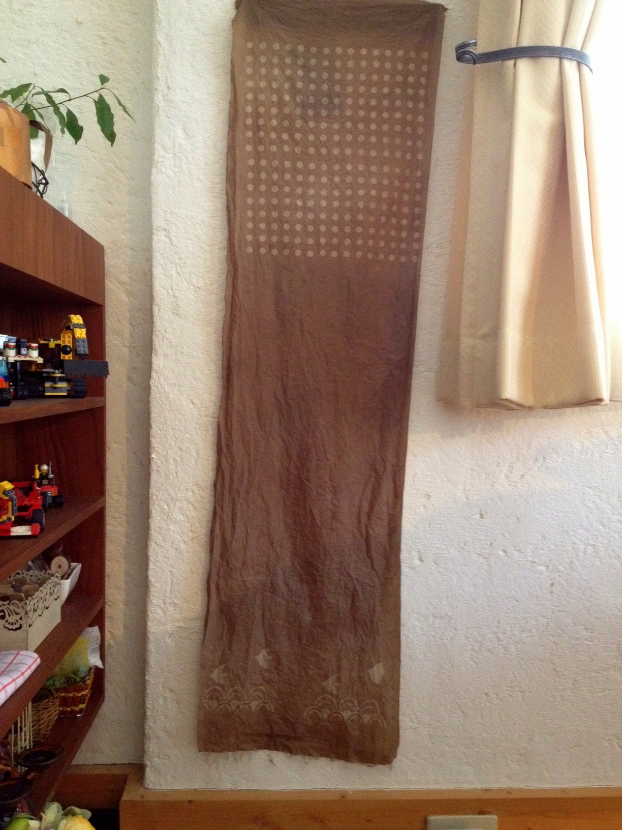 今回は地色をクチナシでうっすら黄色に染めてから、どんぐりで2色目を染めまする。